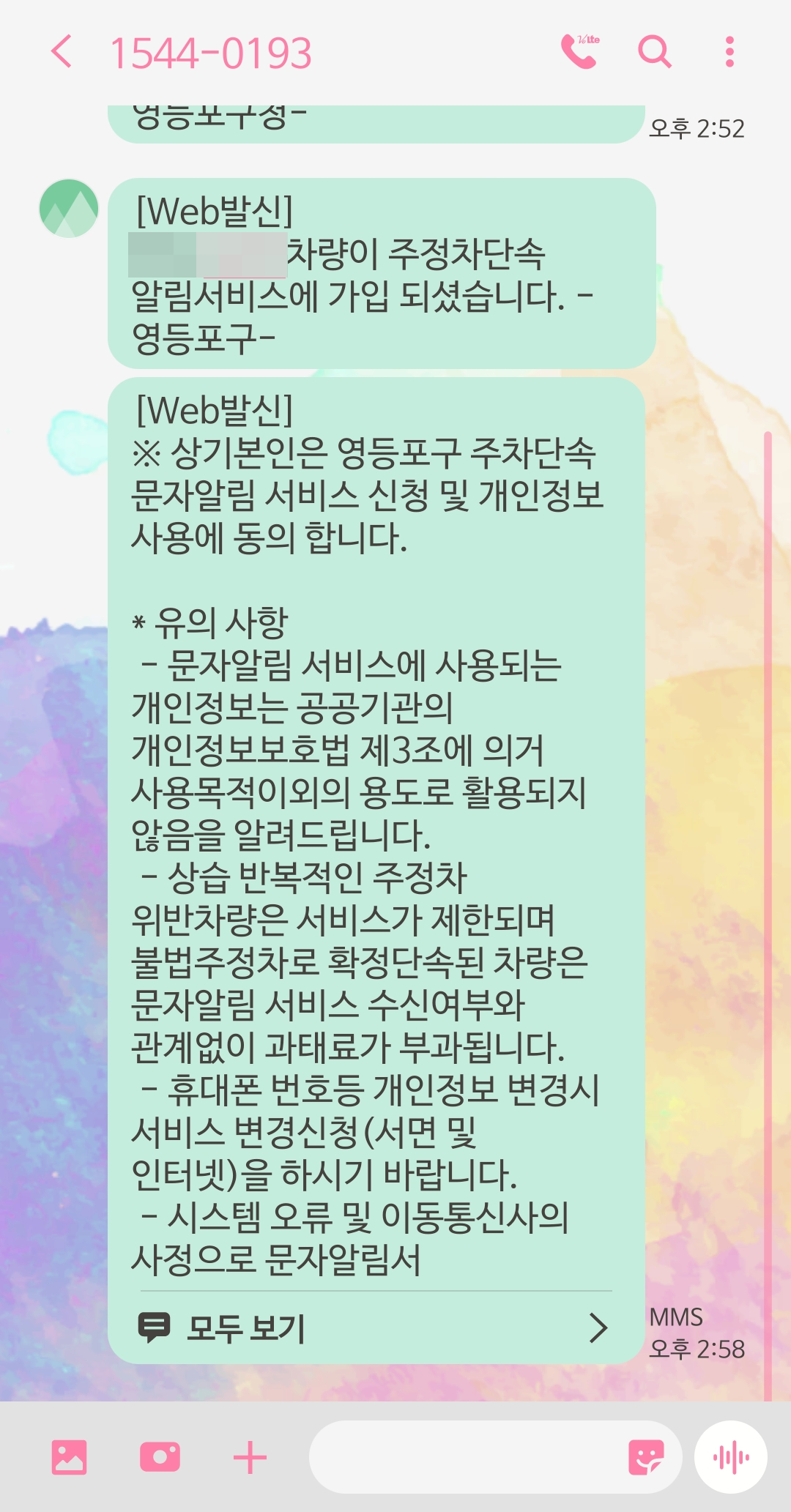 이 문자까지 확인했다면 주정차단속 문자알림 서비스 최종 가입 완료입니다.