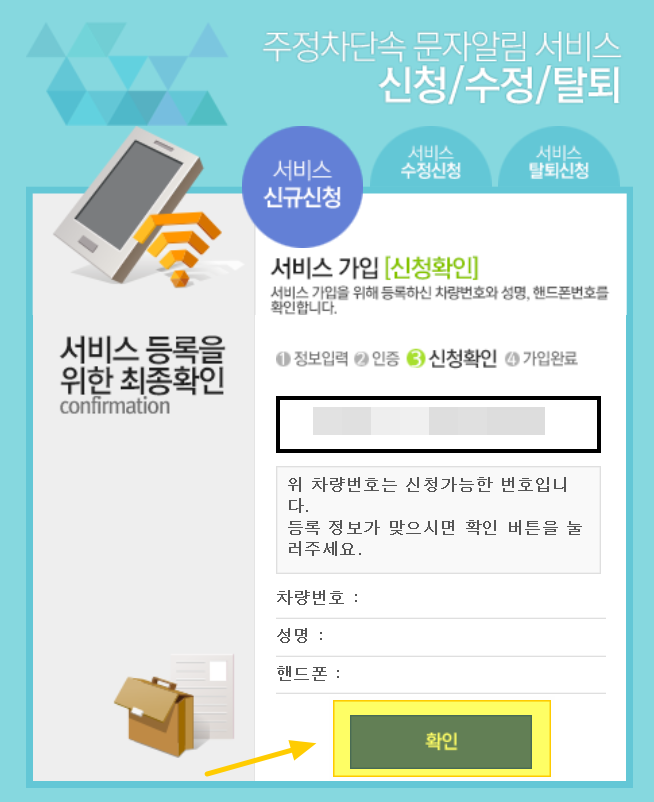 서비스 가입 신청확인이 뜨면 차량번호 확인 후 [확인] 버튼을 클릭합니다.