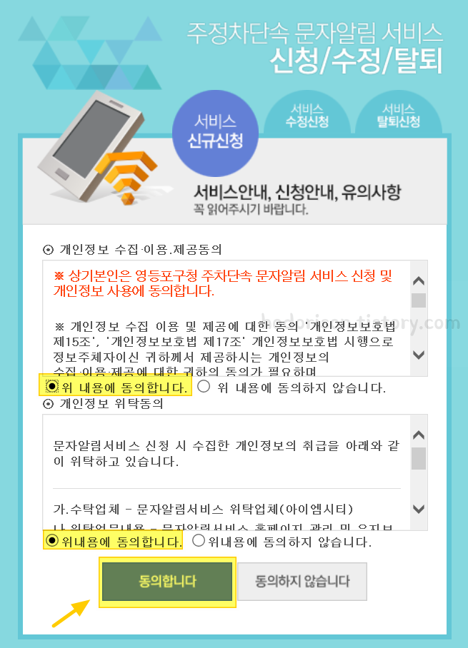 7. 주정차단속 문자알림 서비스를 신청하기 위해서는 먼저 [위 내용을 동의합니다] 두 개를 체크합니다.
