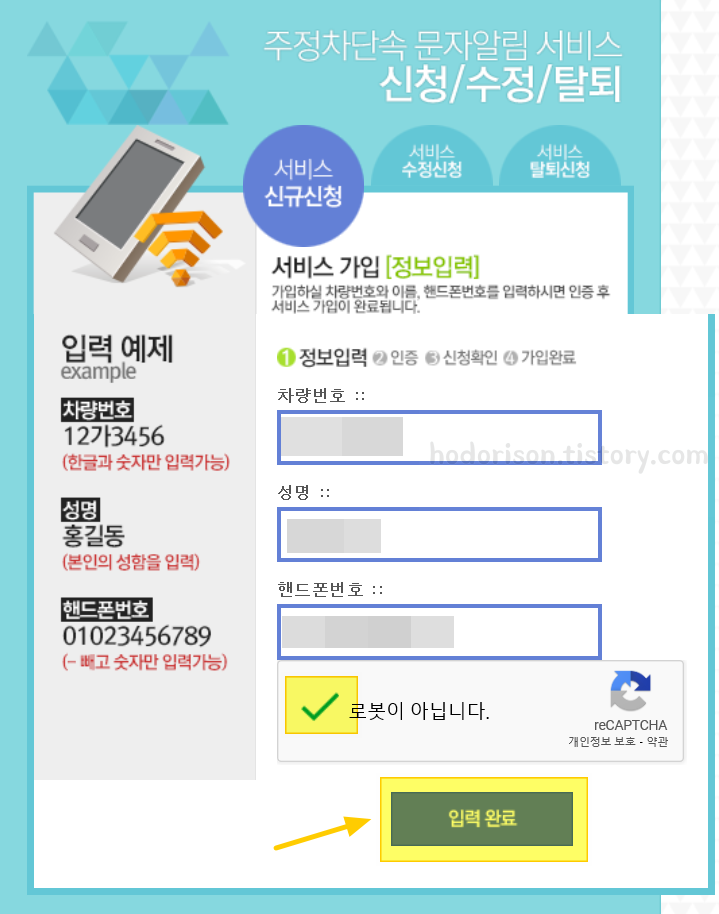 정보입력 창이 뜨면 차량번호, 성명, 핸드폰번호를 입력한 다음 [로봇이 아닙니다] 체크한 후 [입력 완료]버튼을 클릭합니다.
