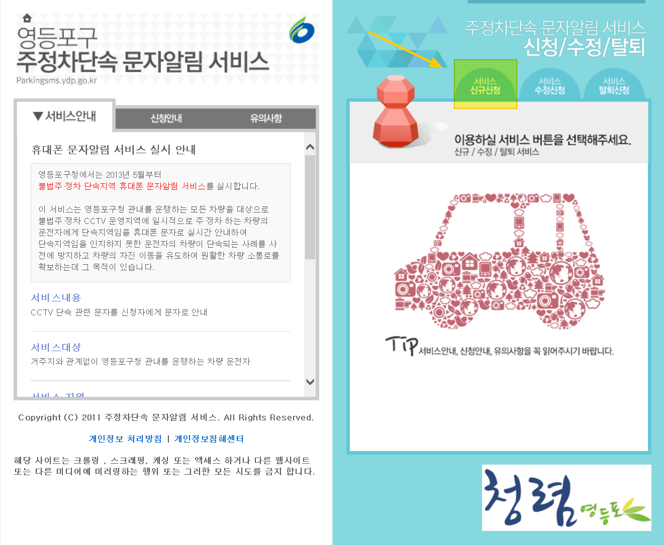 영등포구 주정차단속 문자알림 서비스에 들어가게 되면 왼쪽에 어떤 내용인지 설명이 나와 있고요.