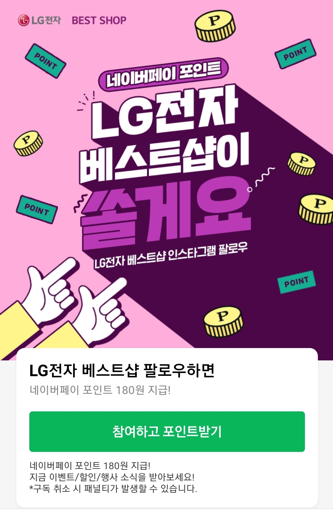 두 번째는 LG전자 베스트샵 인스타그램 팔로우를 하면 네이버페이 포인트 180원을 지급하는 이벤트인데요!
