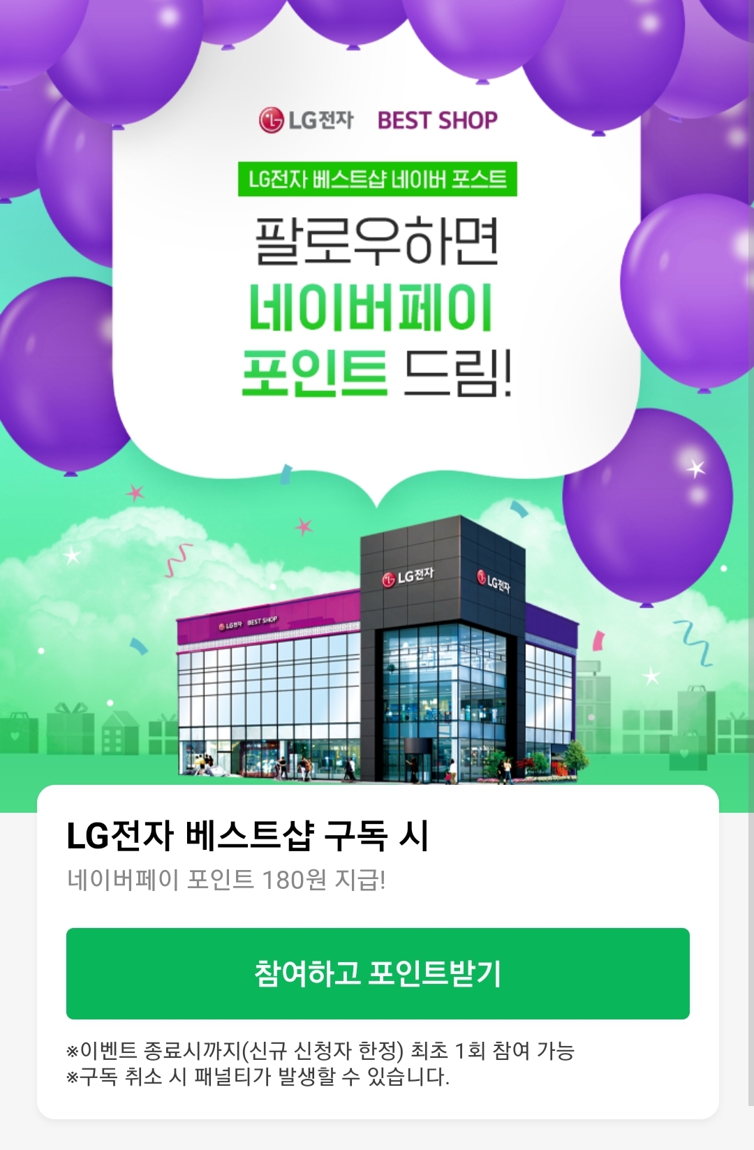 LG전자 베스트샵 이벤트에 참가하면 총 360원의 네이버페이 포인트를 받을 수 있으니 빨리 참가하세요^^