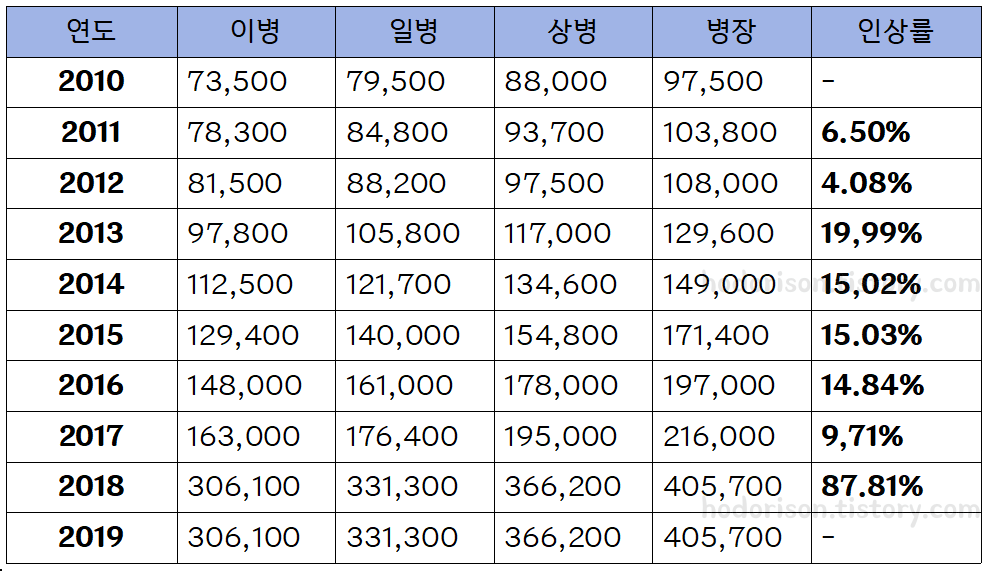 먼저 2010년부터 군인 일반 병사(이등병, 일병, 상병, 병장)의 월급이 어떻게 인상되어 왔는지부터 알려드리겠습니다.
