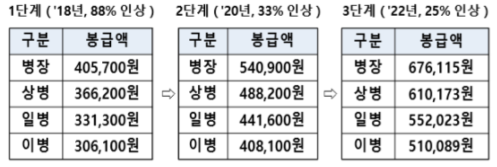 국방의 의무를 다하느라 늘 고생하는 젊은 군 장병들의 월급은 그래도 꽤 높은 인상률을 보이고 있습니다.