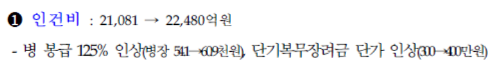 군인 인건비가 21,081억 원에서 22,480억 원으로 증가함에 따라 군인 월급 또한 올랐습니다.