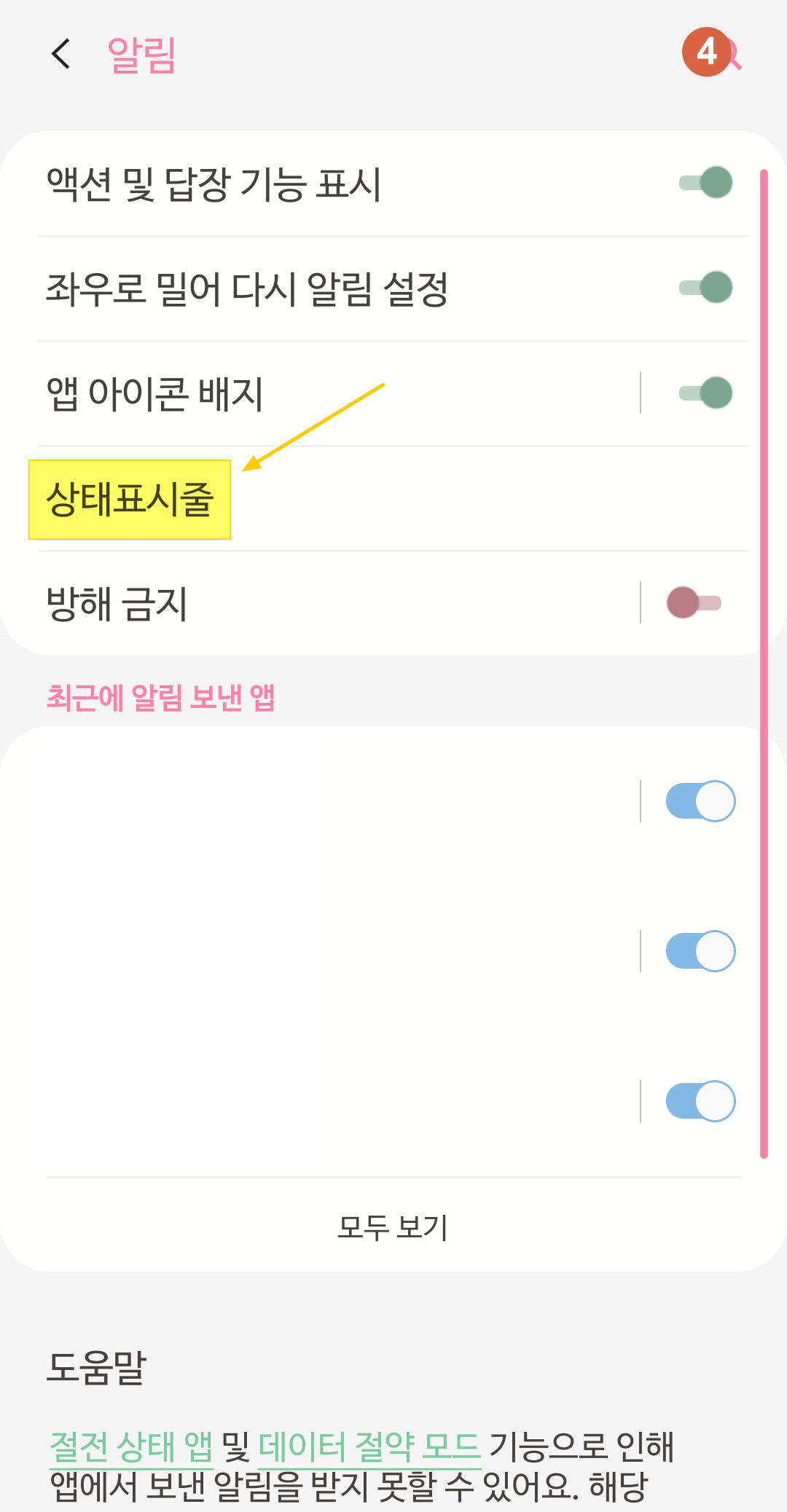 [알림]에서 [상태표시줄]을 클릭해 주세요.