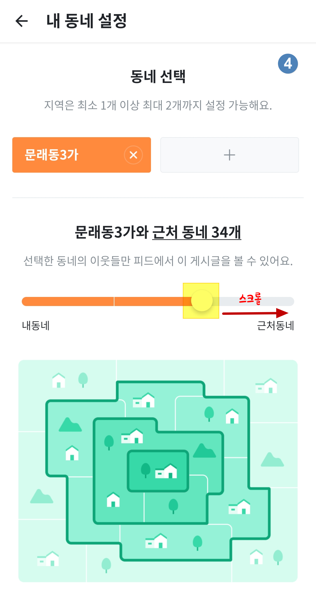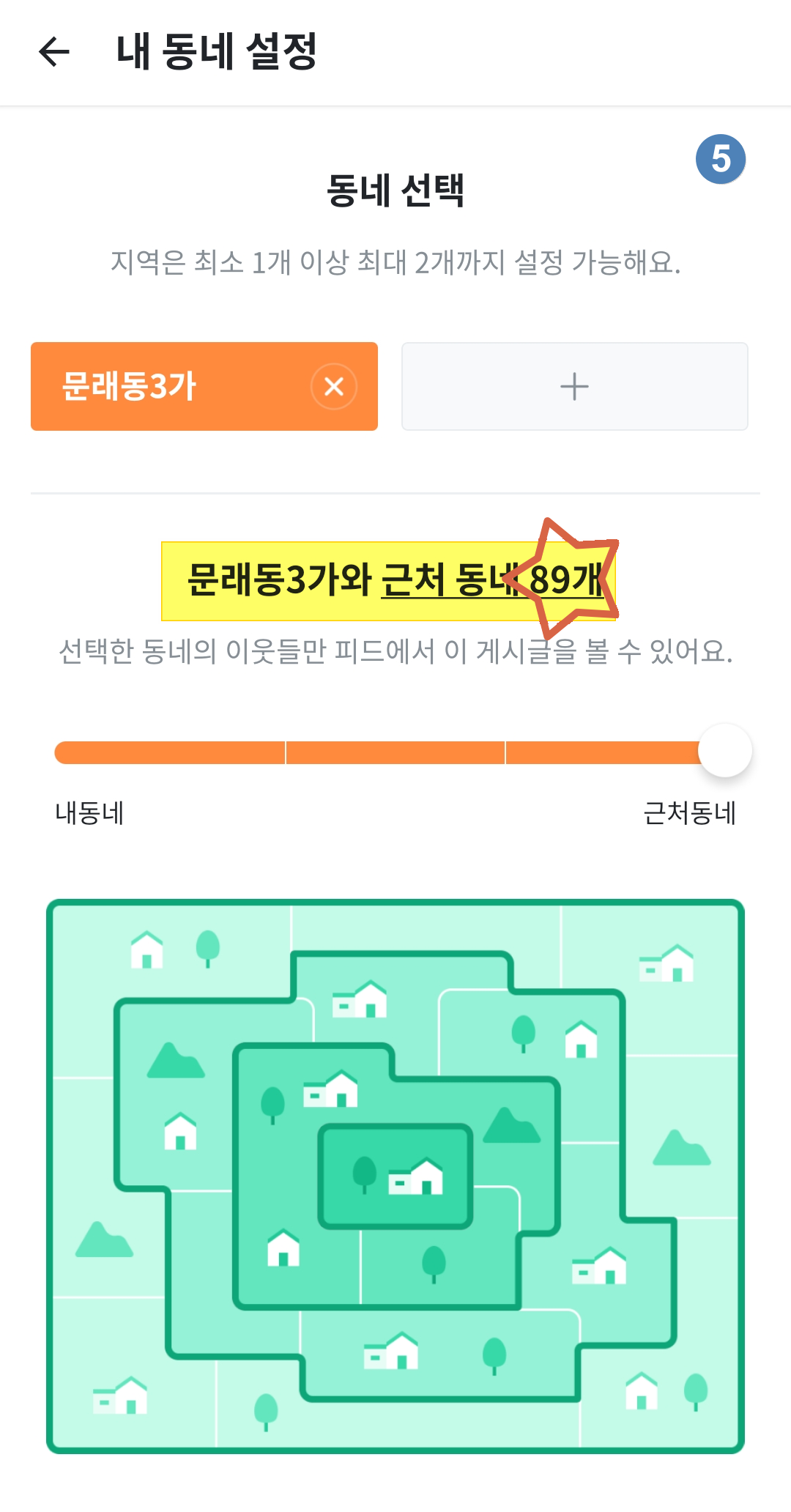3. 주소를 설정하면 4번 사진처럼 (동네 이름)와 근처 동네 00개 이렇게 뜨는데요.