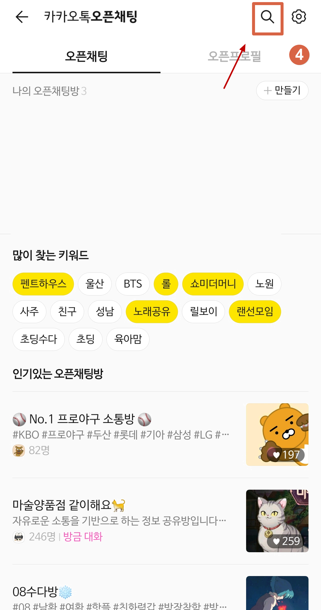 [카카오톡 오픈채팅]에서 오른쪽 상단에 있는 [돋보기] 그림을 클릭합니다.