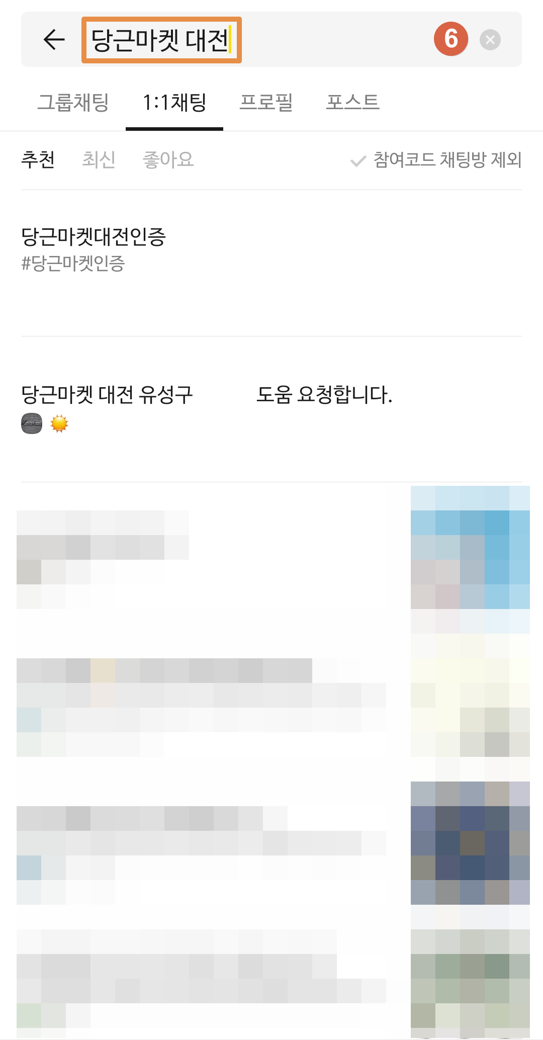 6번 사진처럼 [당근마켓+타지역명]을 검색하면 타지역 인증을 무료로 해주는 오픈채팅 방을 찾을 가능성이 더 큽니다.