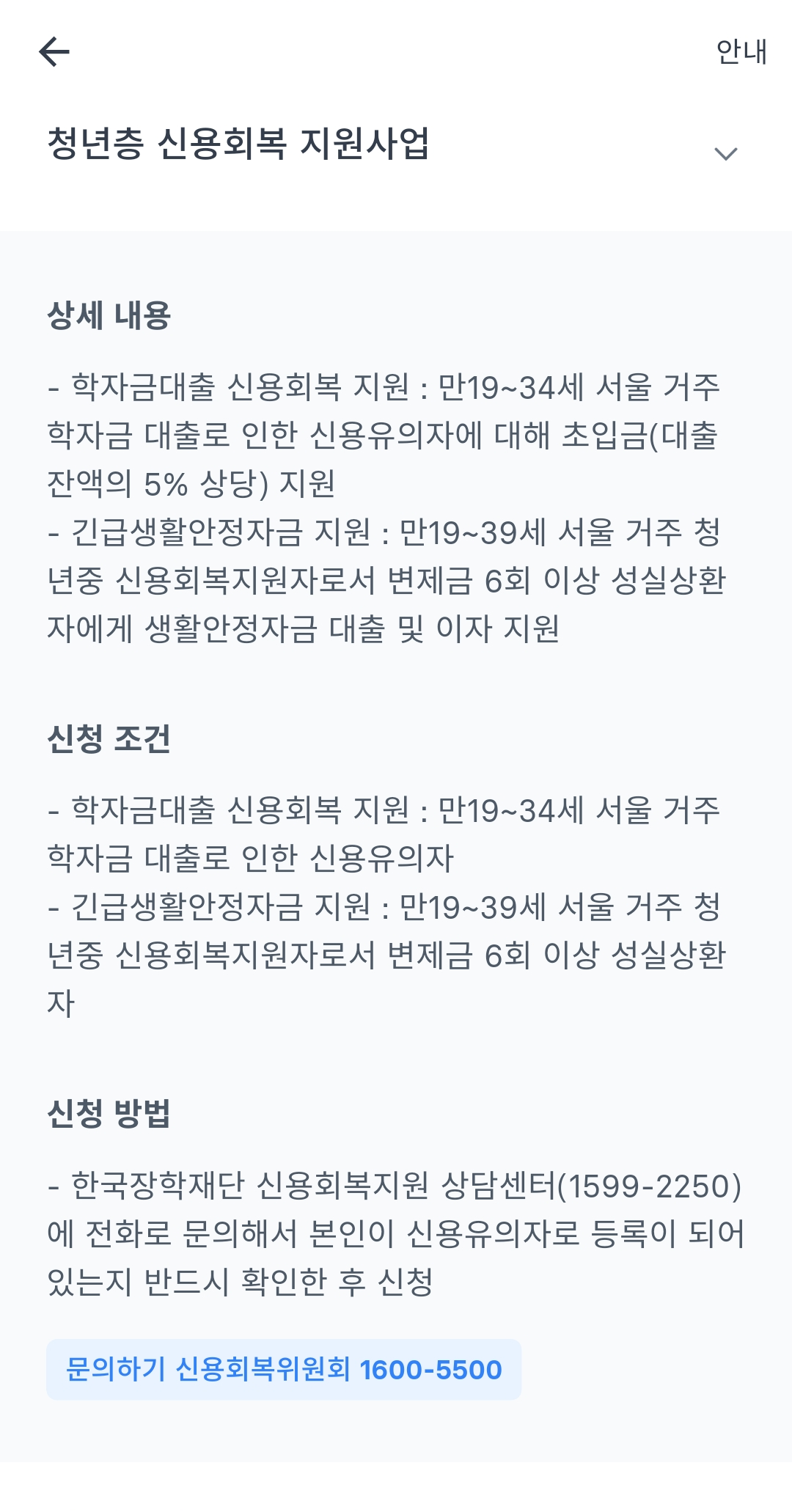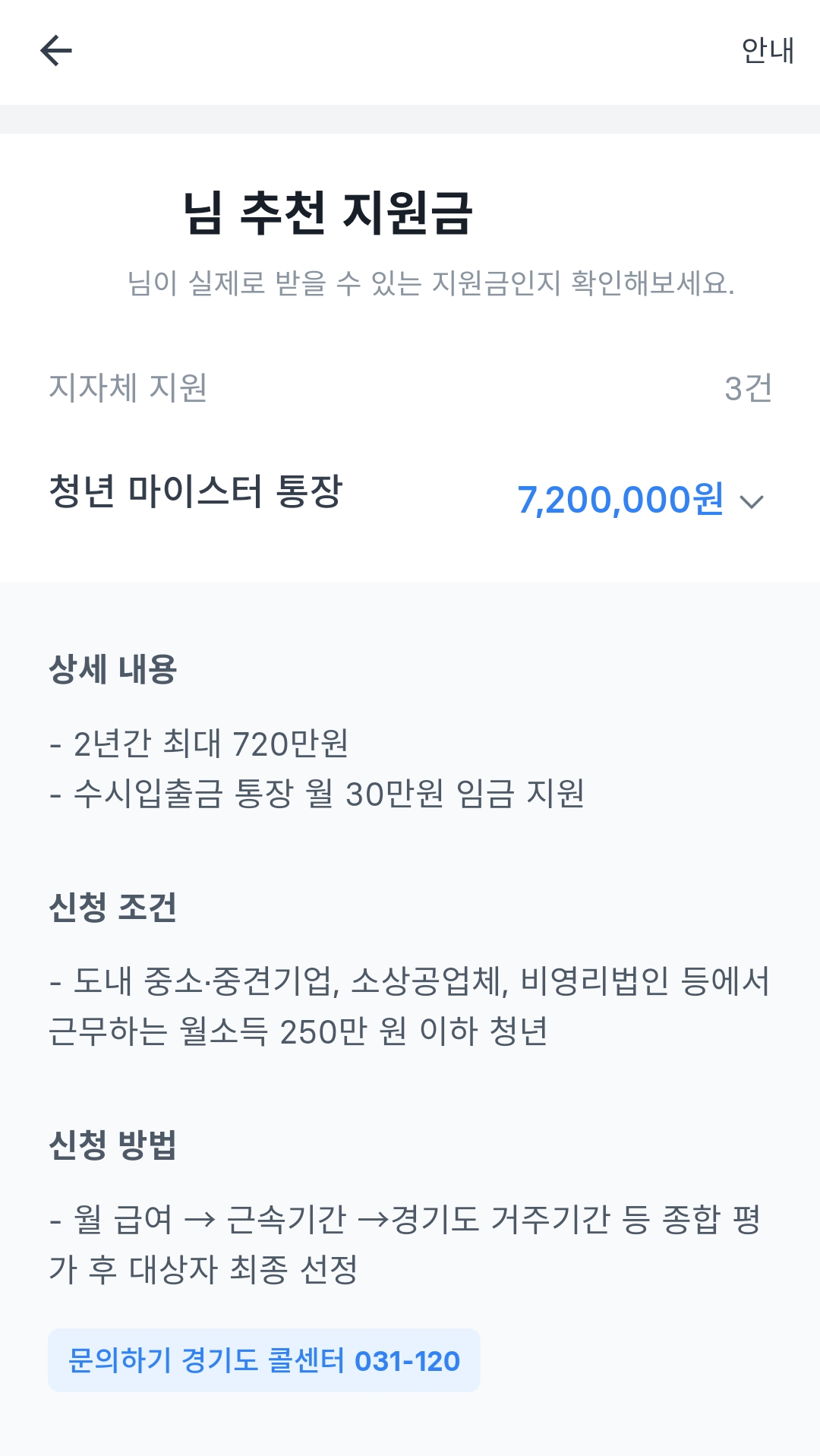 자신이 받을 수 있는 정부지원금의 정확한 정보가 궁금하다면 해당 지원금 내역을 클릭하면 상세 내용, 신청 조건, 신청 방법이 나옵니다.