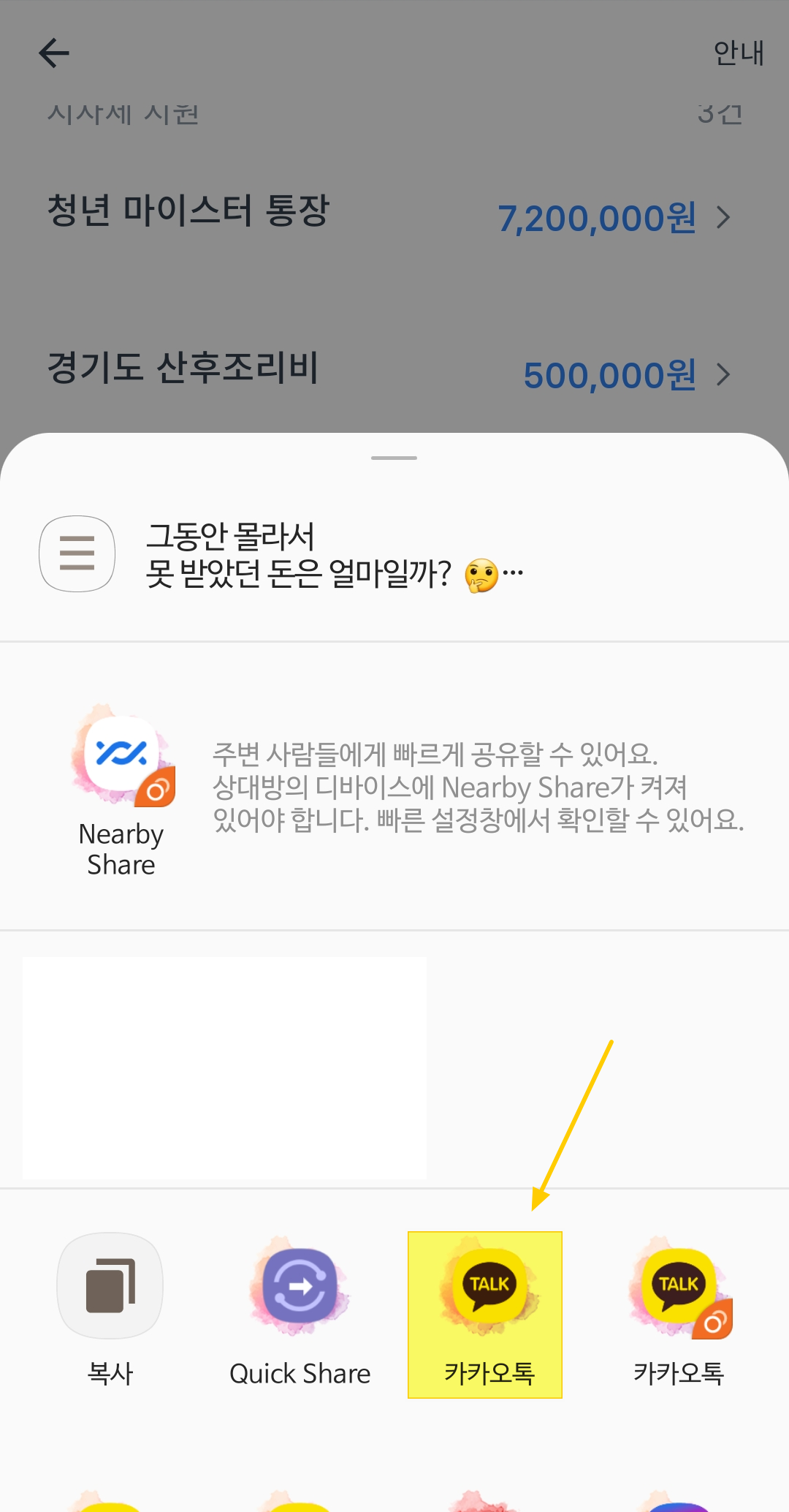 [카카오톡]을 클릭한 후 보내고 싶은 대상자 아이디를 클릭하면 친구에게도 유용한 정보를 알려줄 수 있습니다.