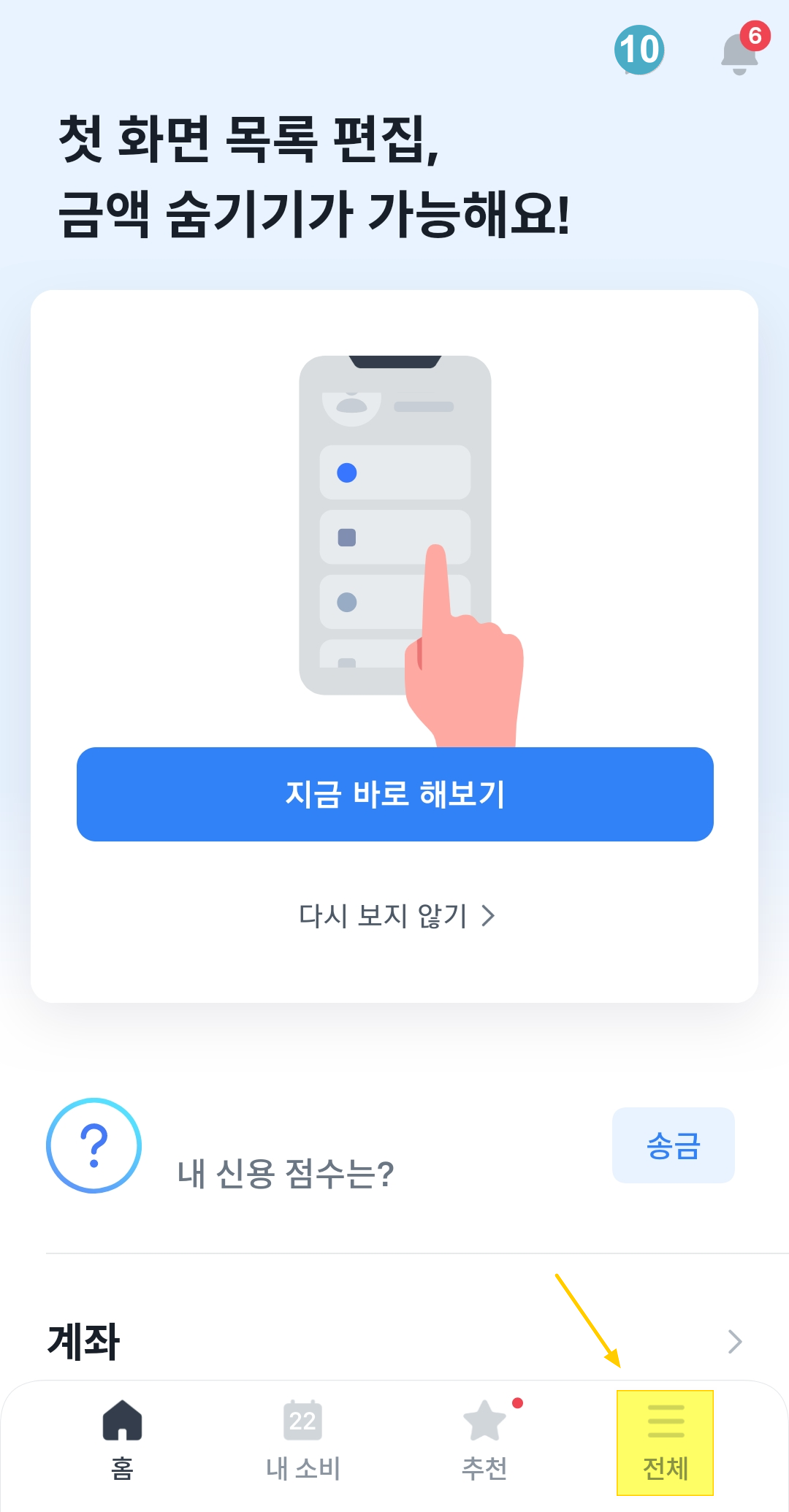 토스 앱 첫 화면 하단 오른쪽에 [전체]를 클릭해 주세요.