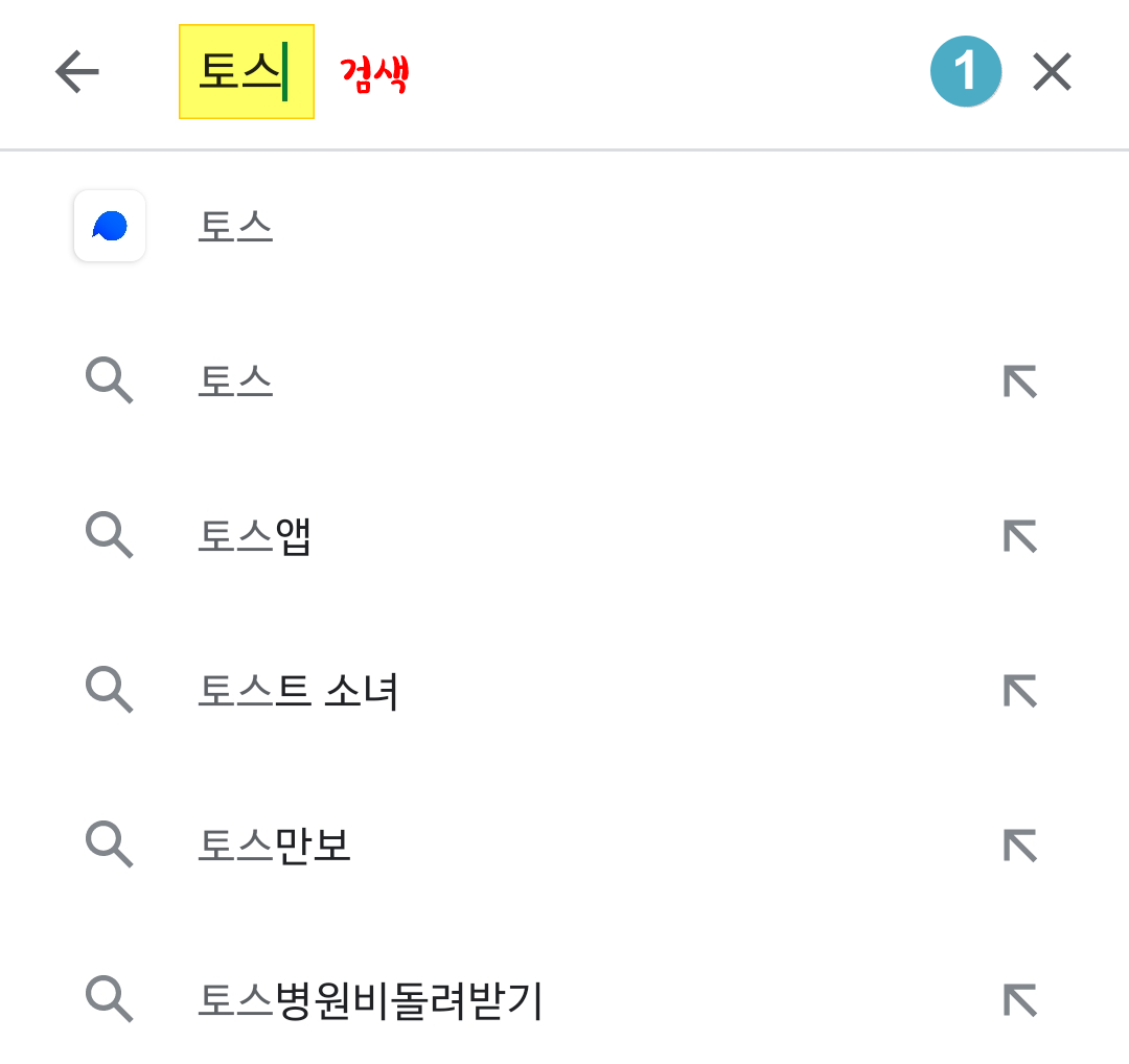 1. 가장 먼저 안드로이드 휴대폰은 플레이스토어에서, 아이폰은 앱스토어에서 [토스]를 검색해 주세요.