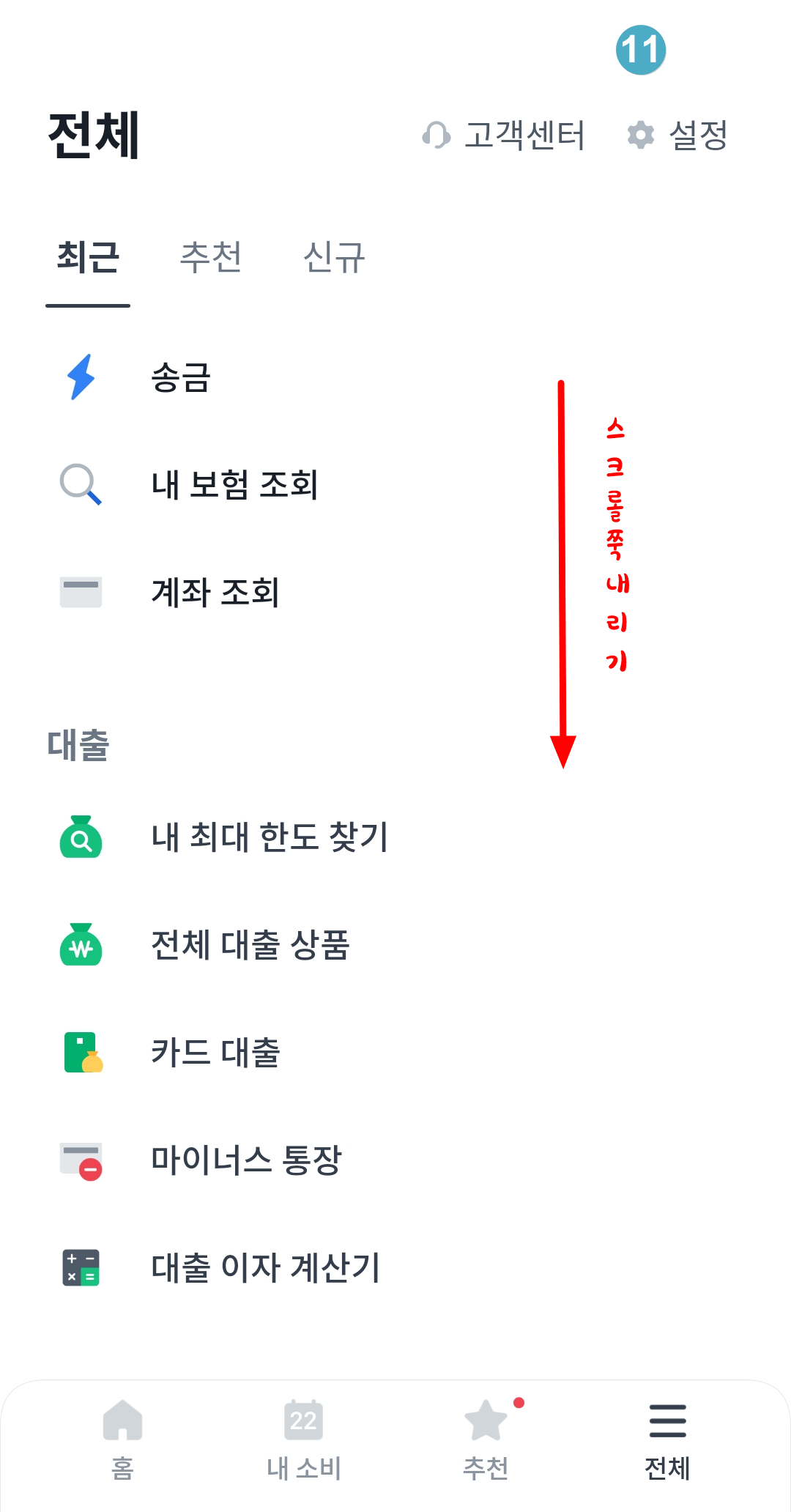 11번 사진처럼 화면이 나왔다면 스크롤을 쭉쭉 내려서 제일 아래까지 내려줍니다.