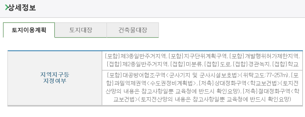 상세정보에서 토지이용계획, 토지대장, 건축물대장을 모두 확인하실 수 있습니다.