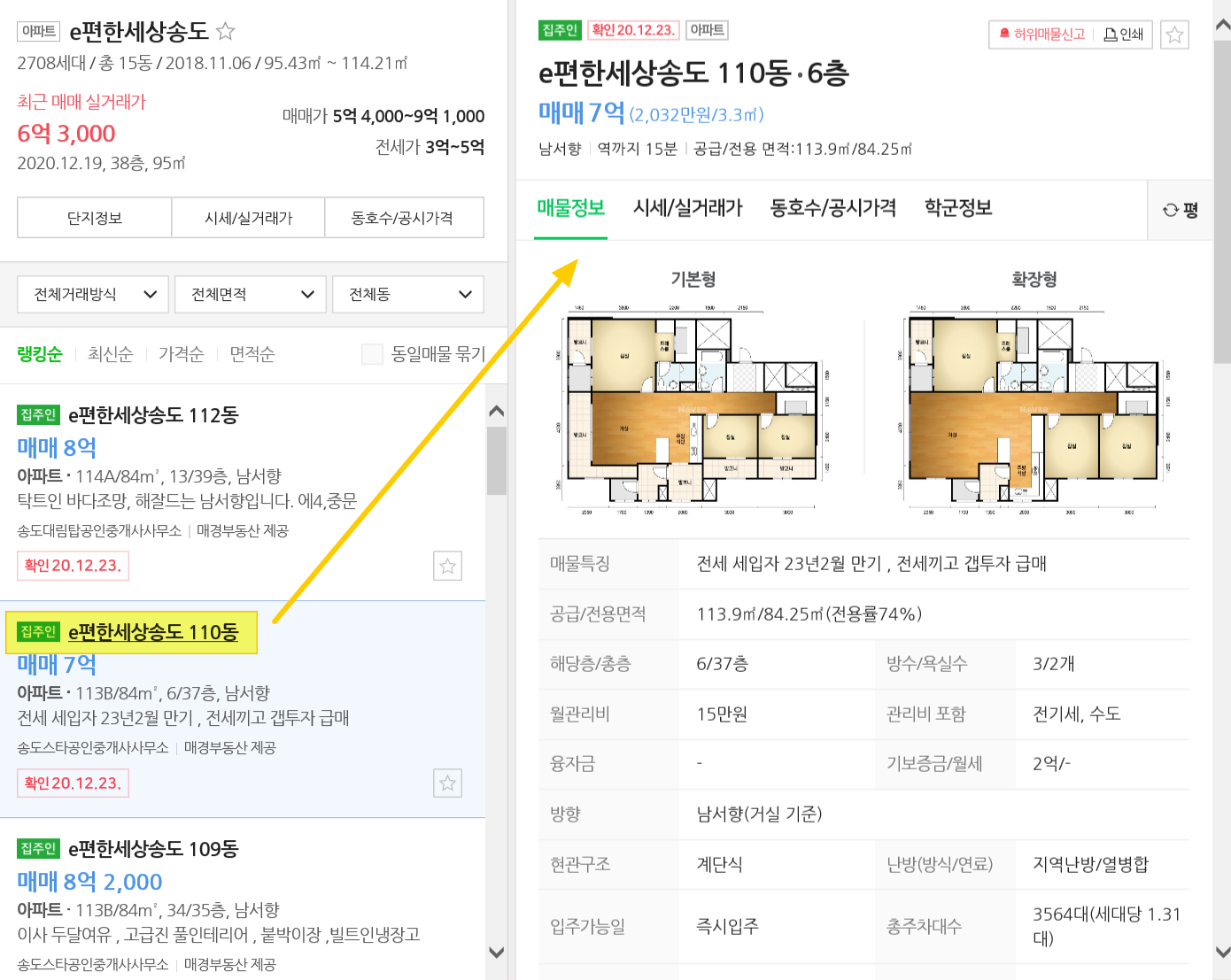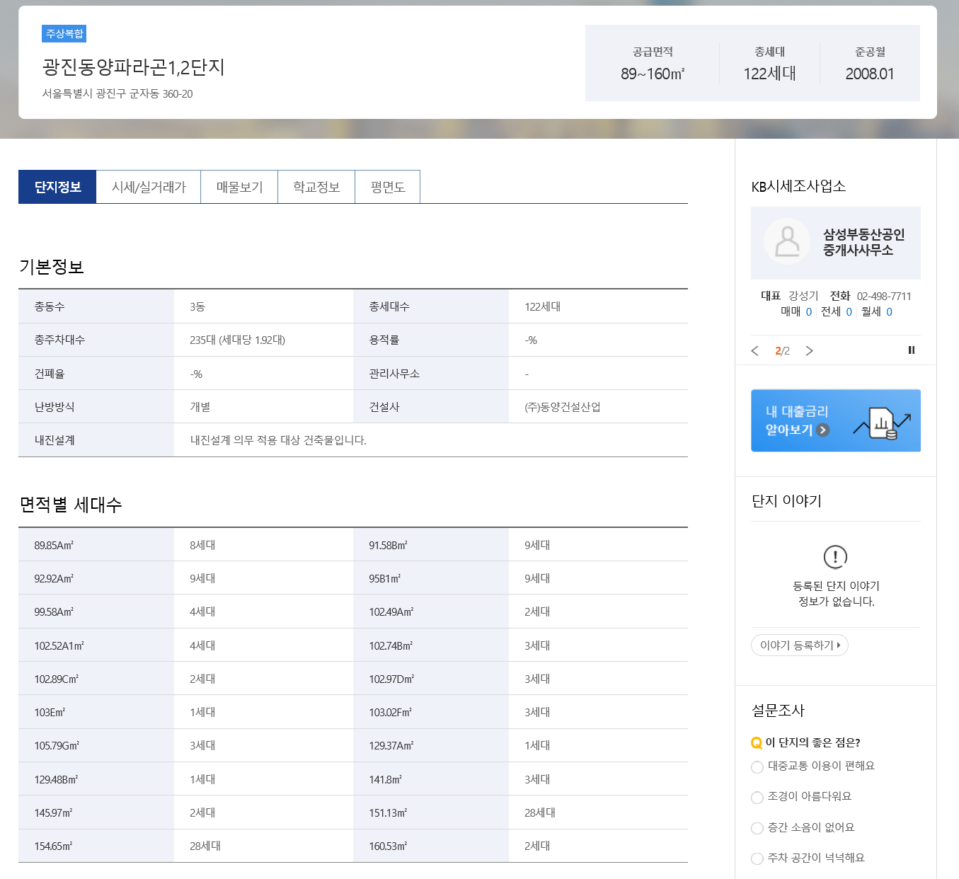 아파트 명을 클릭하면 오른쪽 화면에 전체적인 구조부터 세세한 정보를 알 수 있습니다.