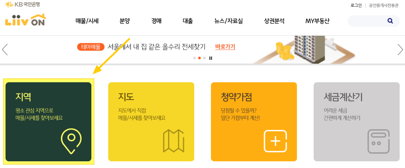2. KB부동산 Liiv ON 사이트에 접속하면 지역, 지도로 검색이 가능합니다.