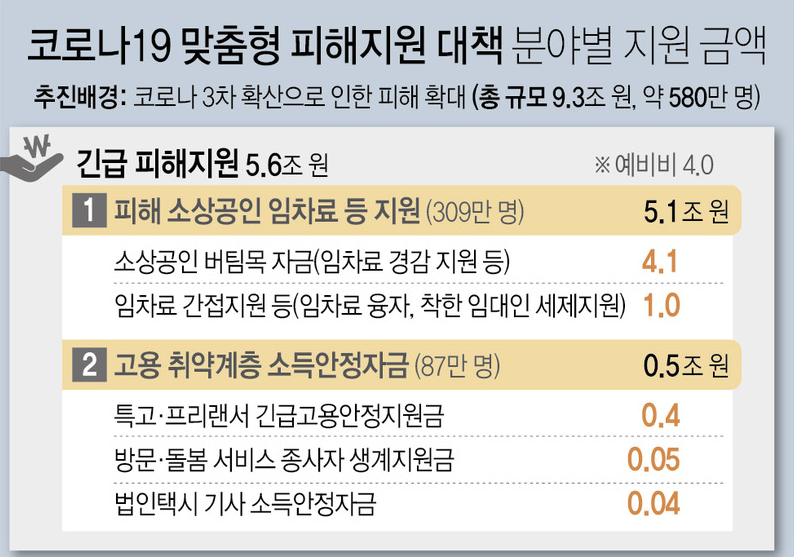 1. 소상공인과 고용취약계층 긴급피해지원 금액 5조 6천억원