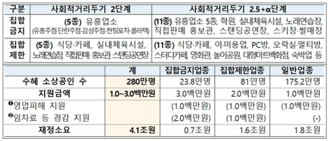 정부의 방역조치로 영업이 금지 또는 제한되었거나, 매출이 감소한 염 매출 4억원 이하 소상공인 280만명에게 현금 지원합니다.