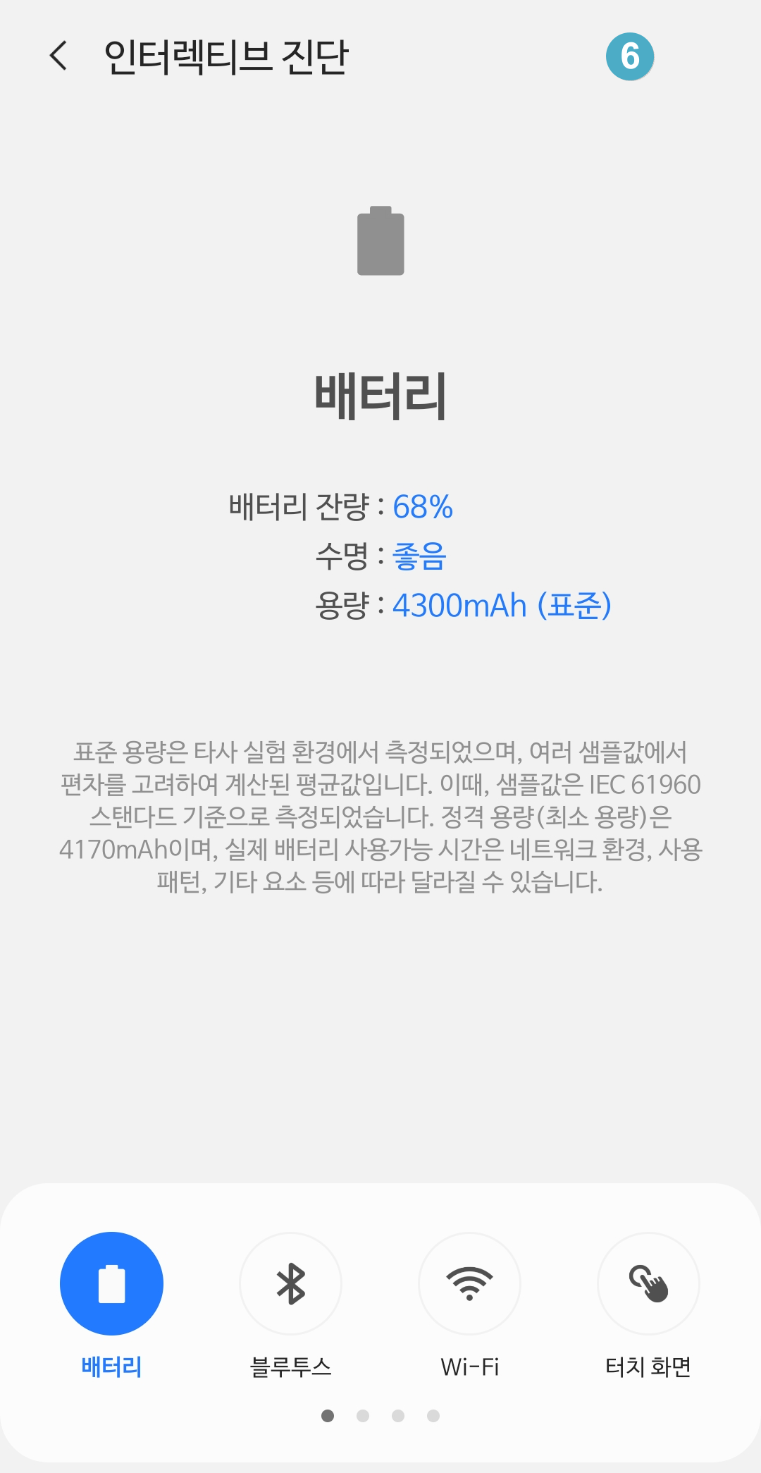 갤럭시 배터리 수명 확인 뿐만 아니라 블루투스, 와이파이, 진동, 스피커, 카메라 등의 상태를 확인할 수 있는데요.