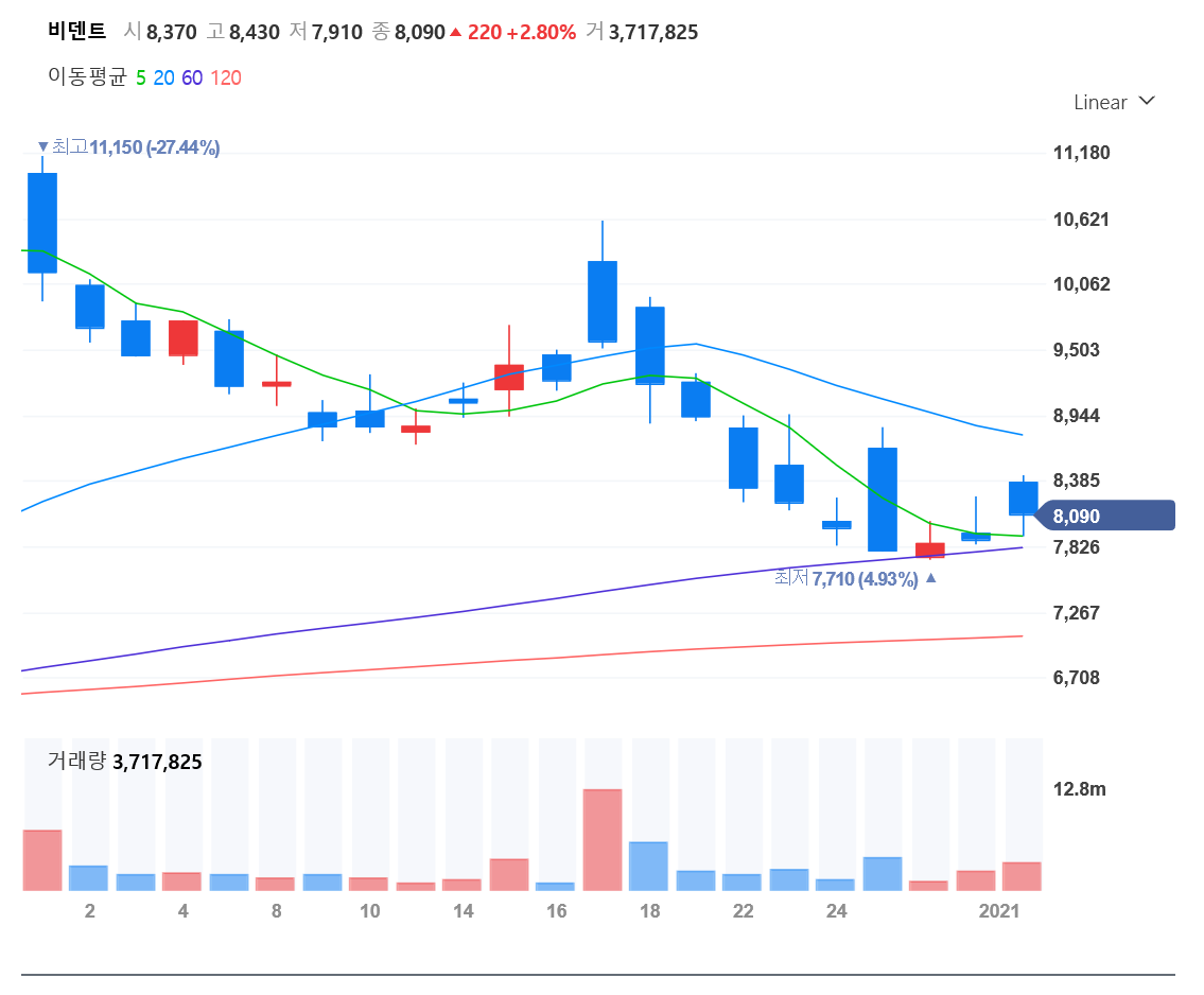가상화폐가 상승세를 타면 비덴트 역시 주가 상승을 하고 있습니다.