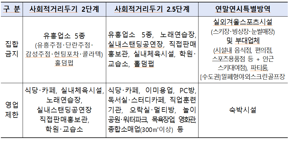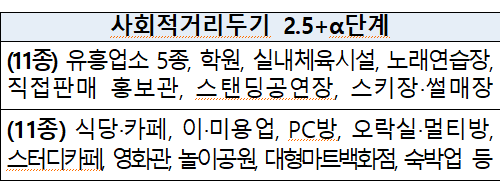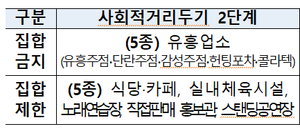 (사회적 거리두기 2단계의 경우 집합금지 5종, 집합제한 5종 / 사회적 거리두기 2.5단계는 집합금지 11종, 집합제한 11종)
