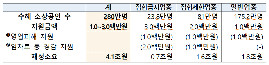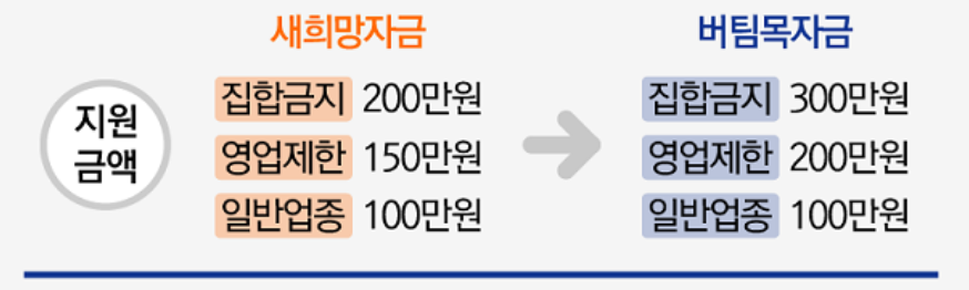 집합제한 업종은 200만원, 집합금지 업종은 300만원을 지원 받습니다.