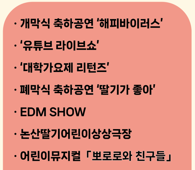 - 지역 문화 공연과 인기 가수의 축하 무대도 마련되어 있어요! (게스트 정보는 추후 공개!)