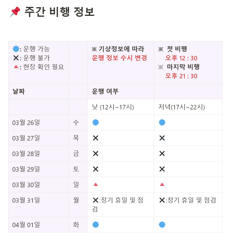 운영시간 : 화요일 ~ 일요일 12시 ~ 22시 (마지막 비행 21:30) / 월요일 정기휴무