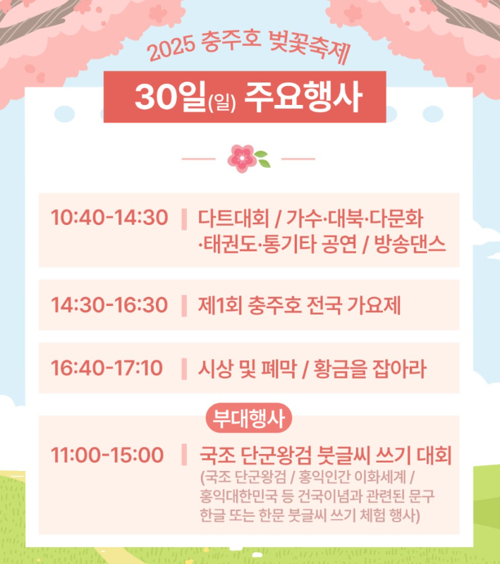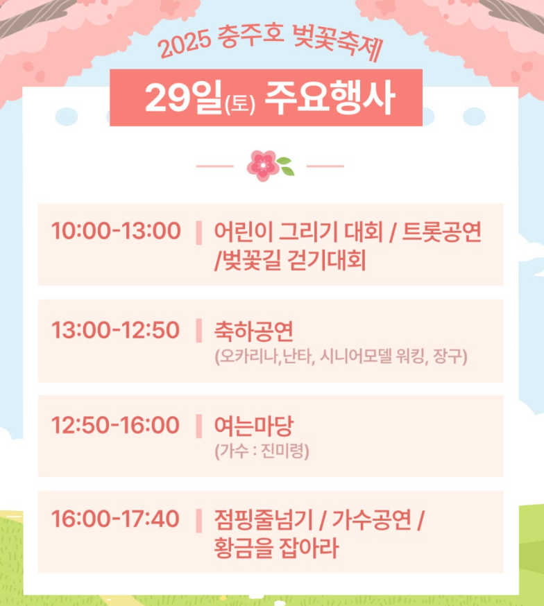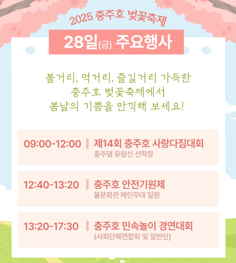 충주호를 따라 만개한 벚꽃길을 거닐며 봄의 정취를 만끽할 수 있는 이번 축제 정보를 꼼꼼히 정리해드릴게요!