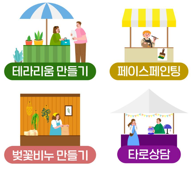 체험 & 벚꽃 플리마켓 존: 벚꽃과 관련된 다양한 만들기 체험과 상품들을 구매할 수 있는 공간입니다. 태라리움 만들기, 페이스페인팅, 벚꽃비누 만들기, 타로 상담 등이 진행됩니다.