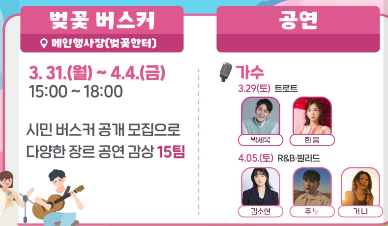 벚꽃 버스킹 무대: 평일에는 디제잉 공연, 주말에는 지역 예술인과 청년 밴드의 버스킹 공연이 펼쳐집니다.
