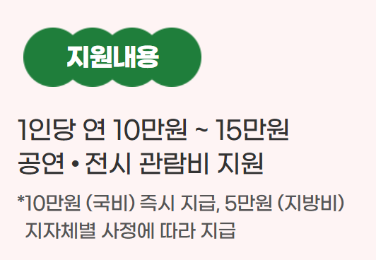 이 지원금은 공연·전시 예매에 사용할 수 있으며, 본인이 원하는 예술 콘텐츠를 선택하여 감상할 수 있습니다. 단, 사용처는 협력 예매처로 제한되므로 해당 플랫폼을 통해 예매해야 합니다.