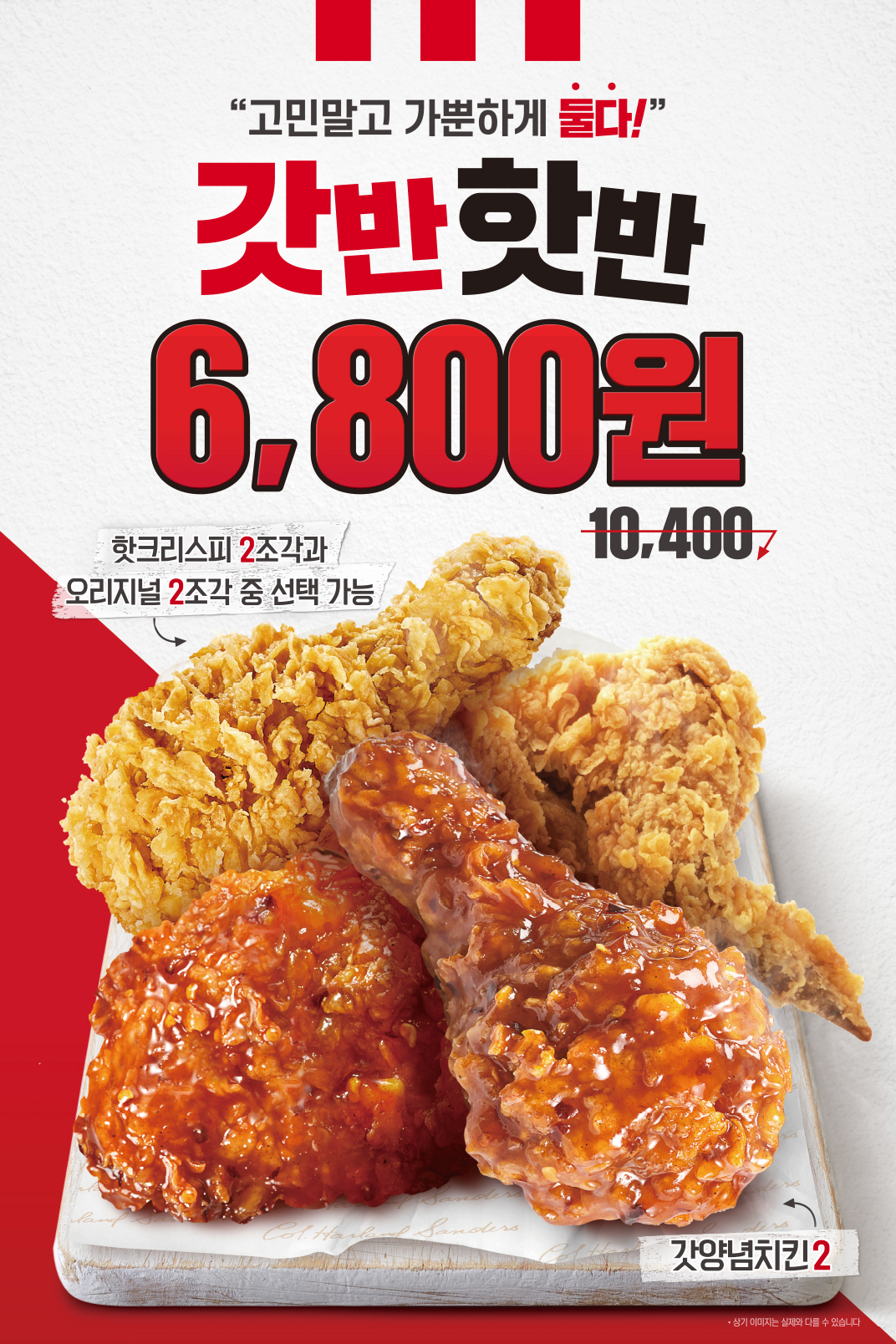 KFC 핫크리스피치킨과 갓양념치킨 갓반핫반 조합을 6,800원에 판매합니다.