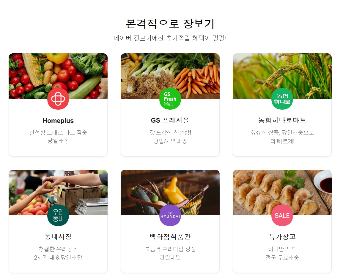그동안 이용하셨던 홈플러스, GS프레시몰, 농폅 하나로마트, 동네시장, 백화점식품관, 특가창고 모두 다 네이버 장보기에서 쇼핑할 수 있어요! 네이버에서 모든 걸 다 할 수 있는 손쉬운 서비스예요.