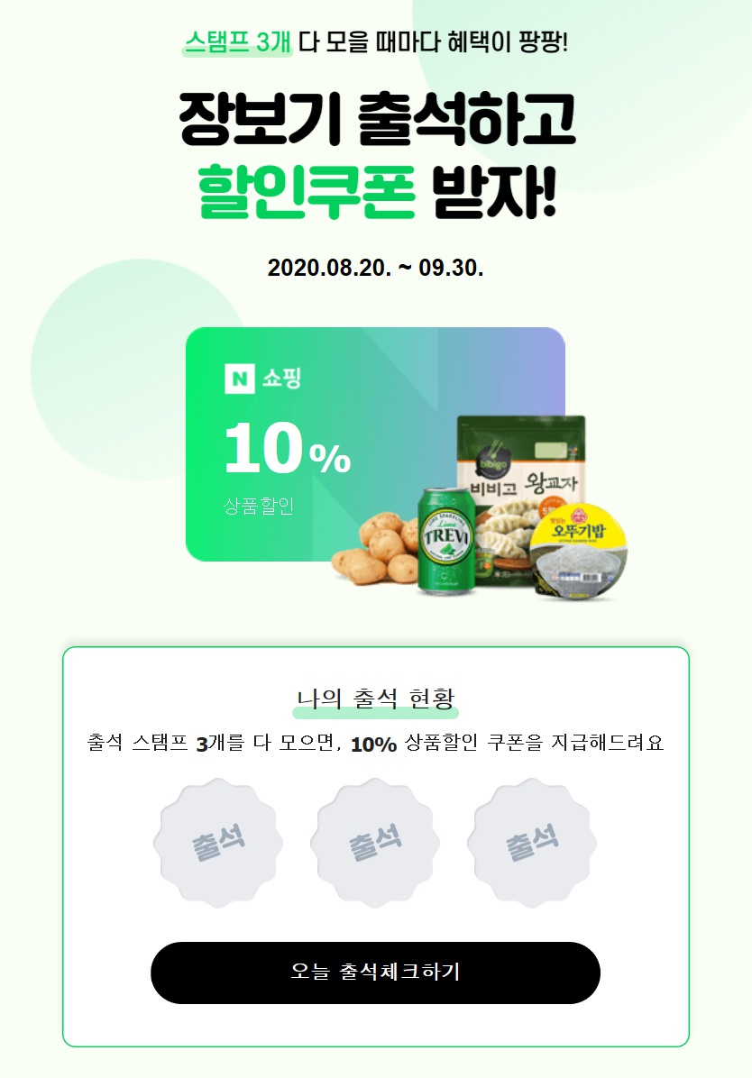 네이버 장보기에서 매일매일 딱 3번 출석하면 10% 할인쿠폰을 지급 받을 수 있는 이벤트예요.