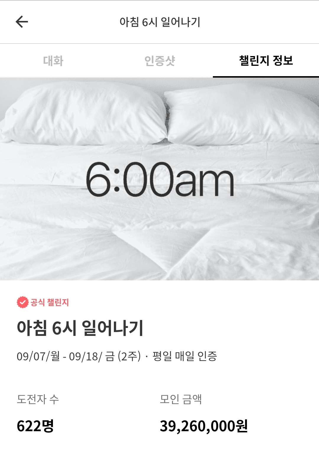 평일 오전 5시에서 6시 사이에 일어나서 기상 인증을해야 하는 미션입니다. 당연히 실패 확률도 높고요. 실패할 확률이 높은만큼 성공하면 많은 상금을 받을 수 있습니다.